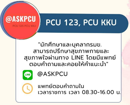 การเปิดช่องทางให้คำปรึกษา ผ่าน LINE @ASKPCU โดยนักศึกษาทุกคน รวมถึงบุคลากรมหาวิทยาลัยขอนแก่นทุกคน ที่ไม่สะดวกขอเข้ารับคำปรึกษาโดยตรงกับ สามารถขอรับคำปรึกษาสุขภาพกายและสุขภาพใจผ่าน LINE @ASKPCU โดยมีแพทย์ผู้เชี่ยวชาญให้คำปรึกษา โดยสามารถนัดหมายเวลาขอรับคำปรึกษาตามเวลาที่นักศึกษาและบุคลากรมีความสะดวก