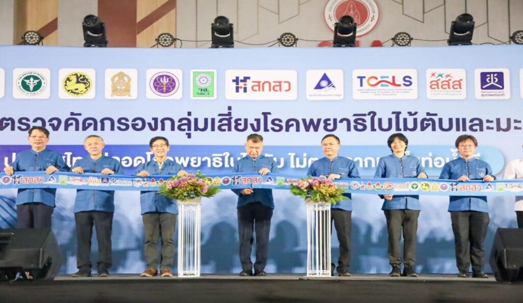 วันที่ 16 กรกฎาคม 2568 สถาบันวิจัยมะเร็งท่อน้ำดี ร่วมกับภาคีเครือข่าย จัดพิธีเปิดมหกรรมการตรวจคัดกรองกลุ่มเสี่ยงโรคพยาธิใบไม้ตับและมะเร็งท่อน้ำดี “ประเทศไทยปลอดโรคพยาธิใบไม้ตับ ไม่ตายจากมะเร็งท่อน้ำดี” โดยได้รับเกียรติจากนายวิชัย ไชยมงคล ที่ปรึกษารัฐมนตรีว่าการกระทรวงสาธารณสุขเป็นประธานในพิธี ท่ามกลางผู้บริหาร เจ้าหน้าที่ และประชาชนที่เข้าร่วมงานกว่า 2000 คน ณ วิทยาลัยการปกครองท้องถิ่น มหาวิทยาลัยขอนแก่น