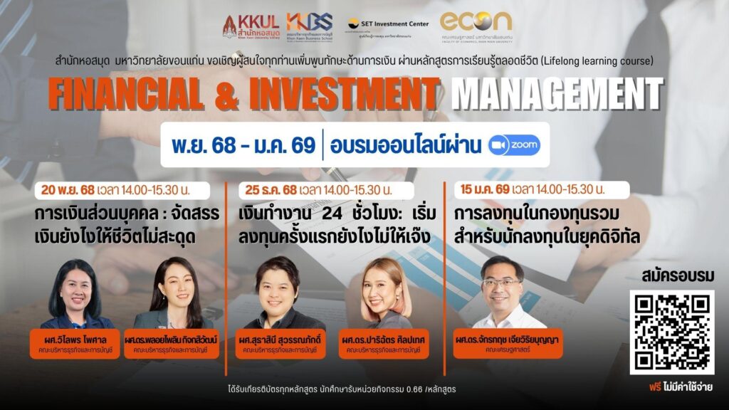 สำนักหอสมุด มหาวิทยาลัยขอนแก่น ขอเชิญชวนผู้สนใจทุกท่านเพิ่มพูนทักษะการเงินการลงทุนผ่านอบรมหลักสูตรการเรียนรู้ตลอดชีวิต หลักสูตรที่ 1 Financial & Investment Management พบกับ 3 หัวข้อที่น่าสนใจ ที่จะช่วยส่งเสริมความรู้ ทักษะ และความเข้าใจในการวางแผนเงินและการลงทุน ให้แก่นักศึกษา บุคลากรของมหาวิทยาลัยขอนแก่น และผู้สนใจทั่วไป ซึ่งจะจัดขึ้นระหว่างเดือนพฤศจิกายน 2568-มกราคม 2569 ลงทะเบียนเข้าร่วมอบรมได้ที่ https://liblearning.kku.ac.th