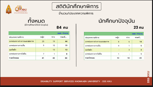ปัจจุบัน ศูนย์ให้การดูแลและสนับสนุนนักศึกษาพิการจำนวน 23 คน ที่กำลังศึกษาอยู่ในสาขาวิชาต่างๆ ทั่วมหาวิทยาลัย ตัวเลขเหล่านี้ไม่เพียงแต่สะท้อนถึงความสำเร็จในการเข้าถึงการศึกษา แต่ยังเป็นเครื่องพิสูจน์ถึงประสิทธิภาพของระบบสนับสนุนที่ครอบคลุมและยั่งยืนที่มหาวิทยาลัยขอนแก่นได้สร้างขึ้น
