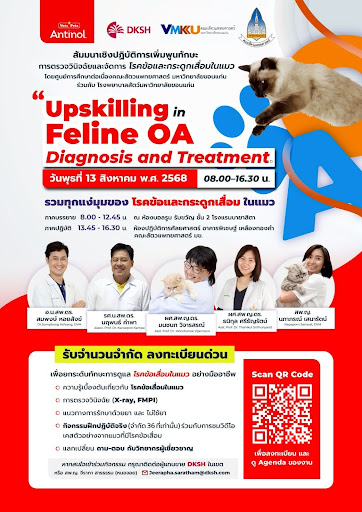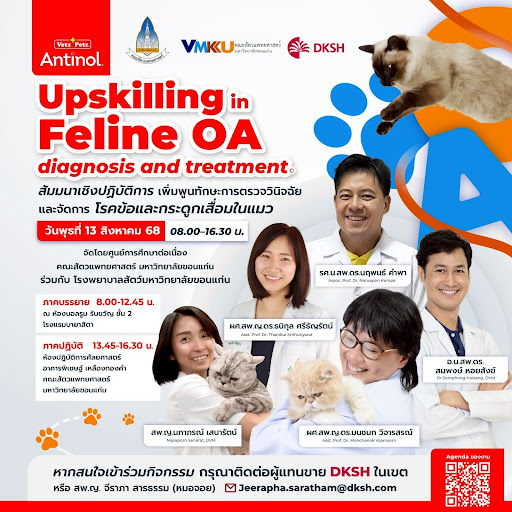บนโลกนี้สัตว์เลี้ยงกลายเป็นส่วนหนึ่งของครอบครัวและมีอายุยืนยาวขึ้น ปัญหาสุขภาพที่เกี่ยวข้องกับวัยสูงอายุของสัตว์เลี้ยงจึงกลายเป็นความท้าทายสำคัญในวงการสัตวแพทย์ เมื่อวันพุธที่ 13 สิงหาคม 2568 คณะสัตวแพทยศาสตร์ มหาวิทยาลัยขอนแก่น ได้ร่วมมือกับบริษัท Vetpetz Antinol (ประเทศไทย) จัดการฝึกอบรมเชิงปฏิบัติการที่มุ่งเน้นการเพิ่มพูนทักษะการตรวจวินิจฉัยและจัดการโรคข้อและกระดูกในแมว เพื่อยกระดับมาตรฐานการดูแลสุขภาพสัตว์เลี้ยงให้ทันสมัยและมีประสิทธิภาพ