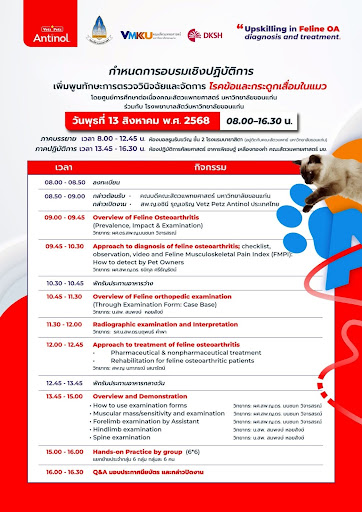 การฝึกอบรมเชิงปฏิบัติการครั้งนี้ได้รับการออกแบบมาเพื่อตอบสนองต่อความต้องการในการพัฒนาทักษะเฉพาะทางของสัตวแพทย์ ในการตรวจวินิจฉัยโรคข้อเสื่อมในแมวที่มีความซับซ้อนและต้องอาศัยเทคนิคการตรวจร่างกายแบบละเอียด โดยการคลำจับข้อต่อต่างๆ อย่างเป็นระบบ การอบรมมุ่งเน้นการสร้างความเข้าใจในการสังเกตเปลี่ยนแปลงพฤติกรรมของแมวที่อาจบ่งบอกถึงปัญหาข้อเสื่อม รวมถึงการแยกแยะระหว่างการเปลี่ยนแปลงที่เกิดจากวัยและการเปลี่ยนแปลงที่เกิดจากโรค