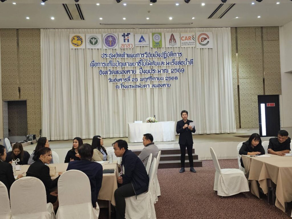 การประชุมเริ่มต้นด้วยการกล่าวถึงความเป็นมาและวัตถุประสงค์แผนงานเป้าหมายสำคัญ “ประเทศไทยปลอดโรคพยาธิใบไม้ตับ ไม่ตายจากมะเร็งท่อน้ำดี” โดย นพ.ศุภกิจ ศิริลักษณ์ ผู้อำนวยสถาบันวิจัยระบบสาธารณสุข (สวรส) ตามด้วยพิธีเปิดโดยได้รับเกียรติจาก นพ.สุรพงษ์ ผดุงเวียง นายแพทย์สาธารณสุขจังหวัดหนองคาย เป็นประธานเปิดการประชุม และ รศ.ดร.วัชรินทร์ ลอยลม ผู้อำนวยการสถาบันฯ กล่าวรายงาน จากนั้นเป็นการกล่าวถึงความเป็นมาและวัตถุประสงค์ของประชุมจัดทำแผนการวิจัยเชิงปฏิบัติการเพื่อการแก้ไขปัญหาพยาธิใบไม้ตับและมะเร็งท่อน้ำดี จังหวัดหนองคาย ปีงบประมาณ 2569 โดย นพ.ธงชัย กีรติหัตถยากร Program Director ตามด้วยการนำเสนอแผนการวิจัยเชิงปฏิบัติการเพื่อการแก้ไขปัญหาพยาธิใบไม้ตับและมะเร็งท่อน้ำดี ในเขตสุขภาพที่ 7, 8, 9, 10 ปีงบประมาณ 2569 โดย รศ.ดร.วัชรินทร์ ลอยลม ผู้อำนวยการสถาบันฯ การนำเสนอผลการดำเนินงานเพื่อการแก้ไขปัญหาพยาธิใบไม้ตับและมะเร็งท่อน้ำดี จังหวัดหนองคาย โดย นพ.แหลมทอง แก้วตระกูลพงษ์ รองนายแพทย์สาธารณสุขจังหวัดหนองคาย และการนำเสนอสถานการณ์บ่อบำบัดสิ่งปฏิกูลในจังหวัดหนองคาย โดย นายจรัสพงศ์ คำดอกรับ ท้องถิ่นจังหวัดหนองคาย ตามลำดับ