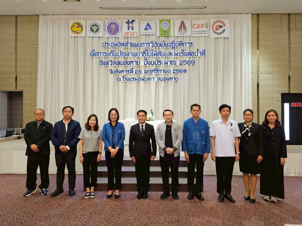 วันที่ 25 พฤศจิกายน 2568 สถาบันวิจัยมะเร็งท่อน้ำดี จัด “ประชุมจัดทำแผนการวิจัยเชิงปฏิบัติการเพื่อการแก้ไขปัญหาพยาธิใบไม้ตับและมะเร็งท่อน้ำดี จังหวัดหนองคาย ปีงบประมาณ 2569” โดยมีผู้แทนจากหน่วยงานต่างๆ ที่เกี่ยวข้องในจังหวัดหนองคาย อาทิ สำนักงานสาธารณสุขจังหวัด สำนักงานศึกษาธิการจังหวัด สำนักงานเขตพื้นที่การศึกษามัธยมศึกษาจังหวัดหนองคาย สำนักงานเขตพื้นที่การศึกษาประถมศึกษาจังหวัดหนองคาย เขต 1 และ 2 สำนักงานประมงจังหวัดหนองคาย สำนักงานพาณิชย์จังหวัดหนองคาย สำนักงานอุตสาหกรรมจังหวัดหนองคาย กลุ่มผู้ประกอบการปลาร้า ปลาส้ม สำนักงานท้องถิ่นจังหวัดหนองคาย สำนักงานที่ดินจังหวัดหนองคาย สำนักงานการปฏิรูปที่ดินจังหวัดหนองคาย สำนักงานป่าไม้จังหวัดหนองคาย ผู้ปกครองนิคมสร้างตนเองโพนพิสัย สำนักงานขนส่งจังหวัดหนองคาย สำนักงานธนารักษ์พื้นที่หนองคาย องค์กรปกครองส่วนท้องถิ่น สำนักงานสาธารณสุขอำเภอทั้ง 9 แห่ง โรงพยาบาลหนองคาย โรงพยาบาลชุมชน และโรงพยาบาลสมเด็จพระยุพราช รวมกว่า 70 คน เข้าร่วมประชุม ณ โรงแรมอมันตา จังหวัดหนองคาย