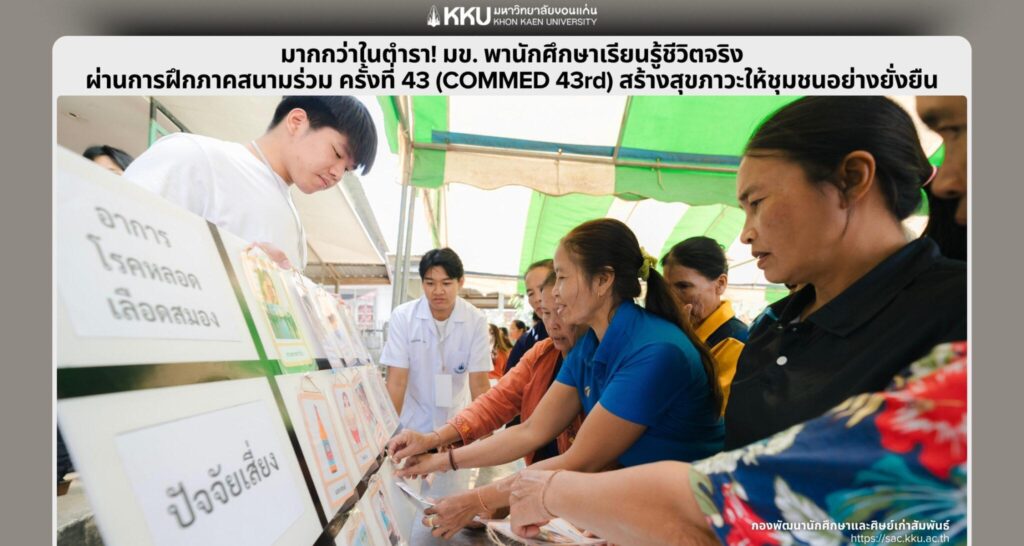 เมื่อวันอาทิตย์ที่ 16 พฤศจิกายน 2568 รศ.ดร.เพ็ญศรี เจริญวานิช รองอธิการบดีฝ่ายกิจการนักศึกษาและนวัตวณิชย์ ปฏิบัติภารกิจแทนอธิการบดีมหาวิทยาลัยขอนแก่น พร้อมด้วย นางเจษฎาพร ศรีรัตนประพันธ์ ผู้อำนวยการกองพัฒนานักศึกษาและศิษย์เก่าสัมพันธ์ และบุคลากร ได้ลงพื้นที่เยี่ยมชมและให้กำลังใจนักศึกษาที่เข้าร่วมโครงการ “การฝึกภาคสนามร่วม ครั้งที่ 43 (COMMED 43rd)” ณ ตำบลท่ากระเสริม อำเภอน้ำพอง จังหวัดขอนแก่น