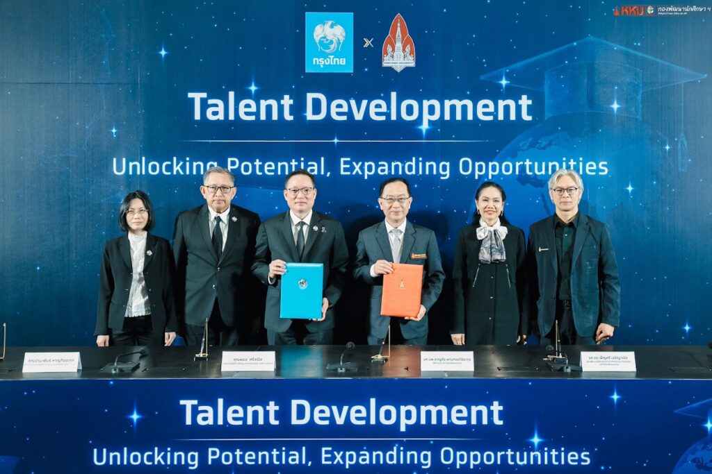 เมื่อวันที่ 14 มกราคม 2569 ฝ่ายกิจการนักศึกษาและนวัตวณิชย์ มหาวิทยาลัยขอนแก่น ร่วมกับธนาคารกรุงไทย จำกัด (มหาชน) จัดพิธีลงนามบันทึกข้อตกลงความร่วมมือโครงการ MOU Talent Development: Unlocking Potential, Expanding Opportunities หรือโครงการพัฒนานักศึกษาฝึกงานและส่งเสริมโอกาสทางอาชีพ พร้อมทั้งพัฒนาศักยภาพบุคลากรและส่งเสริมความรู้ทางการเงินแก่สังคมโดยได้รับเกียรติจาก รศ.นพ.ชาญชัย พานทองวิริยะกุล อธิการบดีมหาวิทยาลัยขอนแก่น และคุณผยง ศรีวณิช กรรมการผู้จัดการใหญ่ ธนาคารกรุงไทยเป็นประธานในพิธี พร้อมด้วย รศ.เพ็ญศรี เจริญวานิช รองอธิการบดีฝ่ายกิจการนักศึกษาและนวัตวณิชย์ มหาวิทยาลัยขอนแก่น คุณปานะพันธ์ หาญกิจจะกุล ที่ปรึกษากรรมการผู้จัดการใหญ่ธนาคารกรุงไทย ผู้บริหาร แขกผู้มีเกียรติ และสื่อมวลชนร่วมงาน ณ ห้องประชุมสารสิน ชั้น 2 อาคารสิริคุณากร มหาวิทยาลัยขอนแก่น