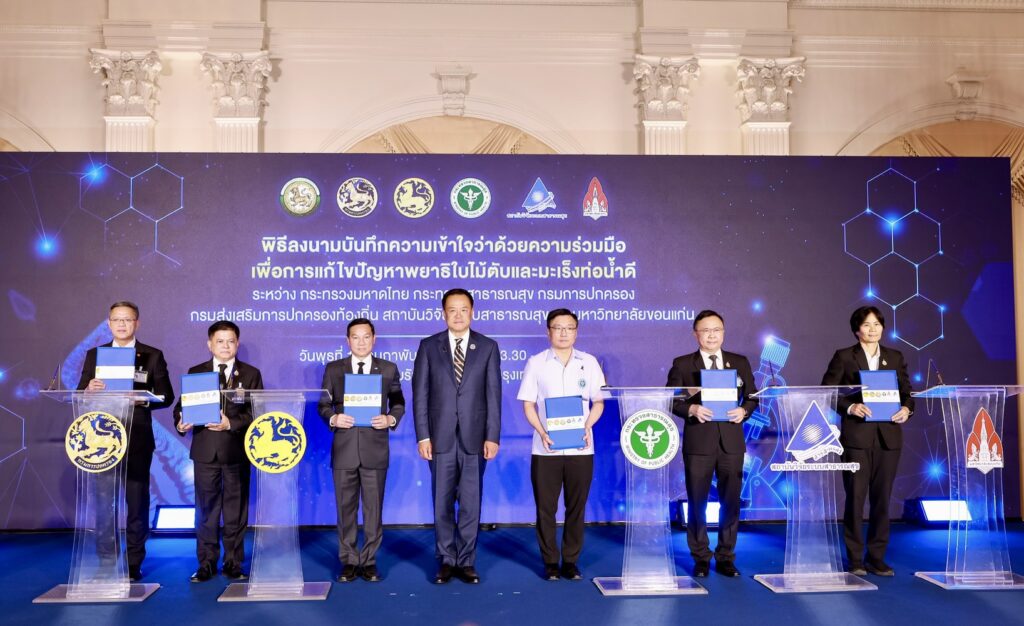 เมื่อวันที่ 11 กุมภาพันธ์ 2569 มหาวิทยาลัยขอนแก่น นำโดย ศ.ดร.ธิดารัตน์ บุญมาศ รองอธิการบดีฝ่ายวิสาหกิจและสังคมยั่งยืน ปฏิบัติหน้าที่แทนอธิการบดีมหาวิทยาลัยขอนแก่น เข้าร่วมพิธีลงนามบันทึกข้อตกลงความร่วมมือ (MOU) ระหว่าง 6 หน่วยงานหลัก โดยมีนายอรรษิษฐ์ สัมพันธรัตน์ ปลัดกระทรวงมหาดไทย นายนฤชา โฆษาศิวิไลซ์ อธิบดีกรมการปกครอง นายธีรุตม์ ศุภวิบูลย์ผล อธิบดีกรมส่งเสริมการปกครองท้องถิ่น นพ.โสภณ เอี่ยมศิริถาวร รองปลัดกระทรวงสาธารณสุข นพ.ศุภกิจ ศิริลักษณ์ ผู้อำนวยการสถาบันวิจัยระบบสาธารณสุข และ ศ.ดร.ธิดารัตน์ บุญมาศ รองอธิการบดีฝ่ายวิสาหกิจและสังคมยั่งยืน มหาวิทยาลัยขอนแก่น ร่วมลงนามบันทึกความเข้าใจครั้งสำคัญ เพื่อร่วมกันขับเคลื่อนยุทธศาสตร์ระดับชาติ “ไทยปลอดโรคพยาธิใบไม้ตับและไม่ตายจากมะเร็งท่อน้ำดี” โดยมี นายอนุทิน ชาญวีรกูล นายกรัฐมนตรีและรัฐมนตรีว่าการกระทรวงมหาดไทยเป็นประธานและสักขีพยาน ณ ตึกสันติไมตรี (อาคารหลังใน) ทำเนียบรัฐบาล เขตดุสิต กทม.
