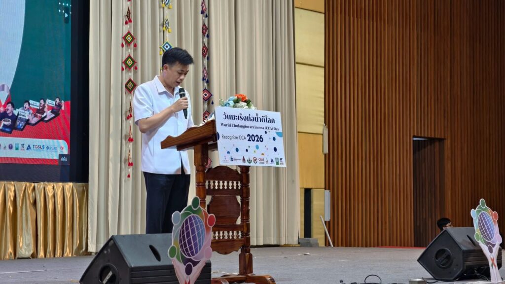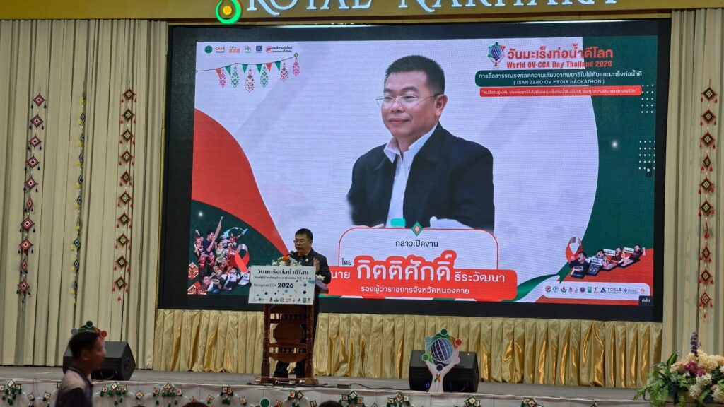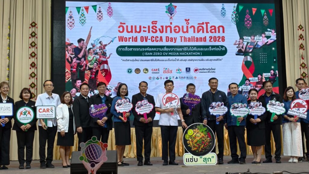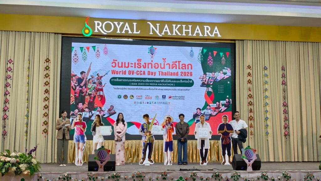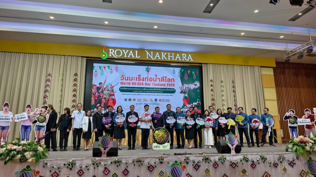 วันนี้ (27 ก.พ. 69) ที่โรงแรมรอยัลนครา อ.เมืองหนองคาย จ.หนองคาย ได้มีการจัดงาน “มหกรรมวันมะเร็งท่อน้ำดีโลก (World OV CCA Day) และการประกวดนวัตกรรมการสื่อสารรณรงค์ “คนอีสานรุ่นใหม่ ปลอดพยาธิใบไม้ตับและมะเร็งท่อน้ำดี” – ISAN ZERO OV HACKATHON โดยมีนายกิตติศักดิ์ ธีระวัฒนา รองผู้ว่าราชการจังหวัดหนองคาย เป็นประธานในพิธีเปิดงาน ฯ มี นพ.แหลมทอง แก้วตระกูลพงษ์ รองนายแพทย์สาธารณสุขจังหวัดหนองคาย กล่าวต้อนรับ , นายแพทย์สุระ วิเศษศักดิ์ รองผู้อำนวยการสถาบันวิจัยระบบสาธารณสุข กล่าวความเป็นมาของการจัดงานฯและแผนมุ่งเป้าประเทศไทยปลอดโรคพยาธิใบไม้ตับ ไม่ตายจากมะเร็งท่อน้ำดี มีประชาชน นักเรียน นักศึกษาและบุคลากรของกระทรวงสาธารณสุขมาร่วมงานกว่า 300 คน