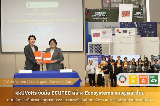 ด้าน นายพลพจน์ วรรณภิญโญชีพ ประธานเจ้าหน้าที่บริหาร บริษัท อีซียู เทค จำกัด กล่าวว่า “ECUTEC ภูมิใจที่ได้ร่วมมือกับ kkUVolts ในการสร้าง Ecosystem อุตสาหกรรมแบตเตอรี่ที่ขับเคลื่อนโดยคนไทยอย่างแท้จริง จุดยืนของเราคือการออกแบบและผลิตระบบบริหารจัดการแบตเตอรี่ หรือ BMS และ Control System ที่สามารถเชื่อมโยงกับ IOT และ AI โดยฝีมือวิศวกรไทย เพื่อยกระดับเทคโนโลยีให้ตอบโจทย์ทั้งด้านความปลอดภัย ความมั่นคง และการบรรลุเป้าหมาย Net Zero ของประเทศ ความร่วมมือครั้งนี้จึงไม่ใช่เพียงแค่การจับมือของสององค์กร แต่เป็นการรวมพลังของงานวิจัยไทย เทคโนโลยีไทย และอุตสาหกรรมไทย และเราหวังว่าความร่วมมือครั้งนี้จะเป็นจุดเริ่มต้นในการเชื่อมโยงผู้เล่นในทุกภาคส่วน เพื่อสร้าง Ecosystem แบตเตอรี่ไทยที่แข็งแรงและยั่งยืน”