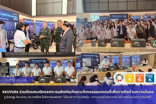 เมื่อวันที่ 16 กันยายน 2568 ที่ศูนย์ประชุมอเนกประสงค์กาญจนาภิเษก โรงงานแบตเตอรี่และพลังงานยุคใหม่ (kkUVolts) ได้รับเกียรติร่วมจัดแสดงนิทรรศการนวัตกรรมพลังงานในกิจกรรมบรรยายพิเศษ “เรื่องเล่าจากแม่ทัพกุ้ง : จากแนวหน้าสู่แนวหลัง สร้างพลังแห่งความสามัคคี” ร่วมกับกองทัพบก ภายใต้โครงการส่งเสริมพลังเยาวชนเพื่อสร้างความมั่นคงแห่งชาติ