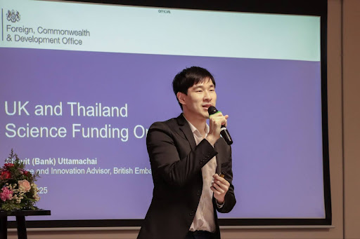 การบรรยายหัวข้อที่สอง “UK Science Funding Opportunities” โดยคุณชวิศ อุตตมาชัย ที่ปรึกษาด้านวิทยาศาสตร์และนวัตกรรม สถานเอกอัครราชทูตอังกฤษ ได้เปิดโอกาสทองให้ผู้เข้าร่วมได้รับข้อมูลโดยตรงเกี่ยวกับแหล่งทุนวิจัยระหว่างประเทศภายใต้ International Science Partnerships Fund (ISPF) และกลไกความร่วมมือระหว่างรัฐบาลไทยและสหราชอาณาจักร โดยเฉพาะในสาขาที่มีศักยภาพสูง เช่น Genomics, ปัญญาประดิษฐ์ (AI), วิศวกรรมชีวการแพทย์ และการต่อต้านเชื้อดื้อยา (AMR)