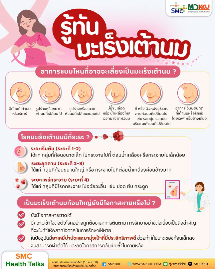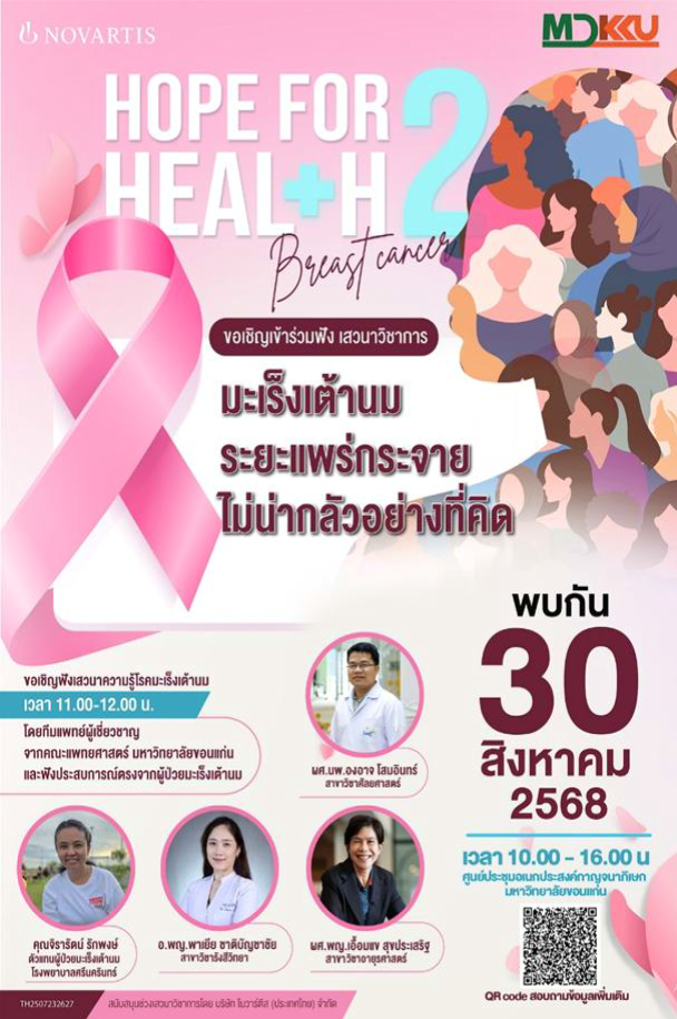 โรงพยาบาลศรีนครินทร์คณะแพทยศาสตร์มหาวิทยาลัยขอนแก่นได้จัดกิจกรรมส่งเสริมสุขภาพ “ผู้หญิงยุคใหม่รู้ทันมะเร็งเต้านม” ขึ้นภายในงานคอนเสิร์ตการกุศล Hope For Health 2 เพื่อผู้ป่วยโรคมะเร็งเต้านม เมื่อวันเสาร์ที่30 กันยายน 2568 ณ ศูนย์ประชุมอเนกประสงค์กาญจนาภิเษก มหาวิทยาลัยขอนแก่น กิจกรรมครั้งนี้มีเป้าหมายเพื่อสร้างความตระหนักรู้เกี่ยวกับโรคมะเร็งเต้านม ซึ่งยังคงเป็นภัยเงียบที่คร่าชีวิตผู้หญิงไทยจำนวนมากในแต่ละปีโดยเฉพาะในกลุ่มวัยทำงานและวัยผู้สูงอายุด้วยความเชื่อว่า“การรู้เท่าทันโรค” คือจุดเริ่มต้นของการมีสุขภาพที่ดีและยั่งยืน ภายในบูธนิทรรศการ “ผู้หญิงยุคใหม่รู้ทันมะเร็งเต้านม” มีการจัดแสดงข้อมูลที่เข้าใจง่ายเกี่ยวกับปัจจัยเสี่ยงสัญญาณเตือนภัยวิธีการตรวจคัดกรองด้วยตนเอง และแนวทางในการป้องกันโรค รวมถึงมีการให้บริการตรวจประเมินสุขภาพเบื้องต้นด้วยเครื่องมือวิเคราะห์องค์ประกอบของร่างกาย (Body Composition) ได้แก่วัดมวลไขมัน มวลกล้ามเนื้อน้ำหนักและค่าดัชนีมวลกาย (BMI) เพื่อช่วยให้ผู้เข้าร่วมสามารถประเมินความเสี่ยงด้านสุขภาพของตนเอง และได้รับคำแนะนำที่เหมาะสมจากทีมสุขศึกษา