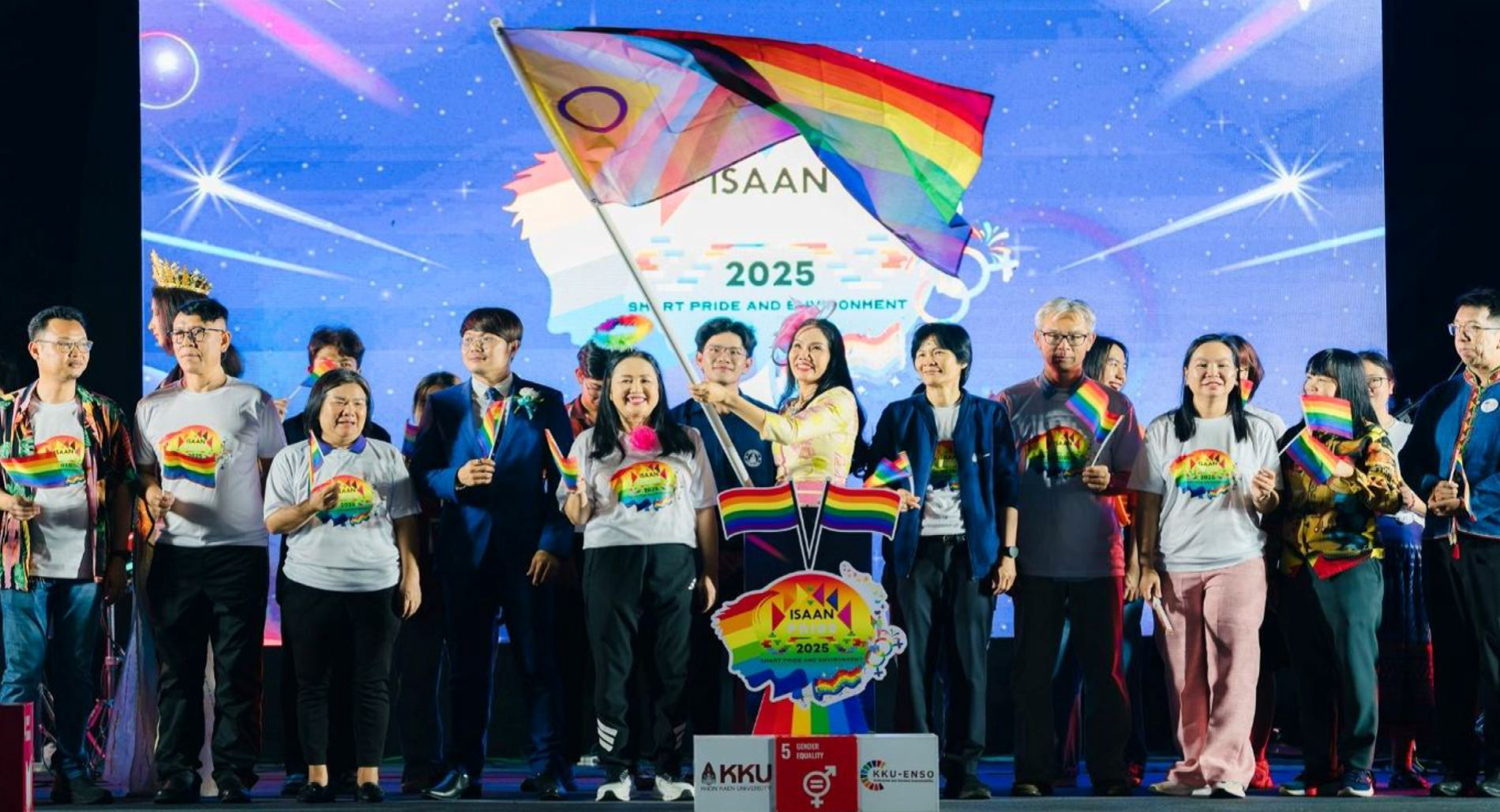 มหาวิทยาลัยขอนแก่นสนับสนุนการขับเคลื่อนความหลากหลายทางเพศ การศึกษา และสิ่งแวดล้อม เพื่อสังคมแห่งความเท่าเทียมและยั่งยืนในวันที่27 มิถุนายน 2568 โดยคณะมนุษยศาสตร์และสังคมศาสตร์มหาวิทยาลัยขอนแก่นได้จัดกิจกรรม “ISAAN PRIDE 2025” อย่างยิ่งใหญ่ภายใต้แนวคิด“Smart Pride and Environment” และจัดขบวนพาเหรด ท่ามกลาง ผู้บริหาร คณาจารย์บุคลากร นักศึกษา ภาคีเครือข่ายและประชาชนทั่วไป ที่มาร่วมกันแสดงออกถึงความหลากหลายทางเพศ สิ่งที่โดดเด่นในงานปีนี้คือการเชื่อมโยงกิจกรรมทางสังคมเข้ากับประเด็นด้านการพัฒนาที่ยั่งยืนสะท้อนถึงความตั้งใจที่จะหลอมรวม “ความหลากหลาย ความรู้และความยั่งยืน” ให้กลายเป็นวิถีทางใหม่ของสังคมไทยยุคปัจจุบันโดยการจัดงานครั้งนี้ไม่เพียงแต่มุ่งส่งเสริมสิทธิของกลุ่มผู้มีความหลากหลายทางเพศซึ่งสอดคล้องกับSDG 5: ความเท่าเทียมทางเพศ (Gender Equality) และการร่วมกันส่งเสียงคามเท่าเทียมในครั้งนี้ไม่ได้หยุดอยู่ที่การให้พื้นที่แสดงออกเท่านั้นแต่ยังรวมถึงการวางรากฐานของสังคมที่เข้าใจและยอมรับตั้งแต่ระดับนักศึกษาใหม่ไปจนถึงบุคลากรและประชาชน ซึ่งสอดคล้องกับเป้าหมายของโลกในการสร้างสังคมที่ไม่ทิ้งใครไว้ข้างหลังโดยเฉพาะในประเด็นความเท่าเทียมทางเพศ และ SDG 4: การศึกษาที่เท่าเทียมและครอบคลุม(Quality Education) การศึกษาที่เปิดกว้างให้ทุกคนได้เรียนรู้อย่างเท่าเทียมโดยปราศจากการตีตรา ในขณะเดียวกันการรณรงค์ด้านสิ่งแวดล้อมที่ผสานอยู่ในงานอย่างแนบเนียน ไม่ว่าจะเป็นรถกอล์ฟพลังงานสะอาดที่ปรากฏในขบวน ตลอดจนเนื้อหาทางวัฒนธรรมที่หยิบยกประเด็นโลกร้อนและการอนุรักษ์ทรัพยากร กลายเป็นสิ่งสะท้อนว่า“Pride” ไม่ใช่เพียงเรื่องของเพศ แต่ยังเกี่ยวข้องกับการมีจิตสำนึกต่อโลกที่เราอาศัยอยู่ร่วมกันตาม SDG 11: Sustainable Communities เพื่อชุมชนยั่งยืน