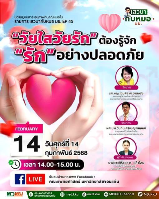 เสวนากับหมอ มข. EP.45 ได้ถ่ายทอดสดผ่านเพจ คณะแพทยศาสตร์ มหาวิทยาลัยขอนแก่นภายใต้หัวข้อ“วัยใสวัยรักต้องรู้จัก‘รัก’อย่างปลอดภัย”