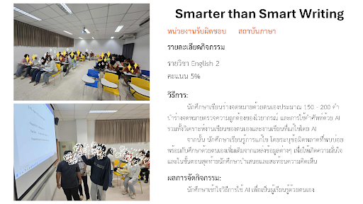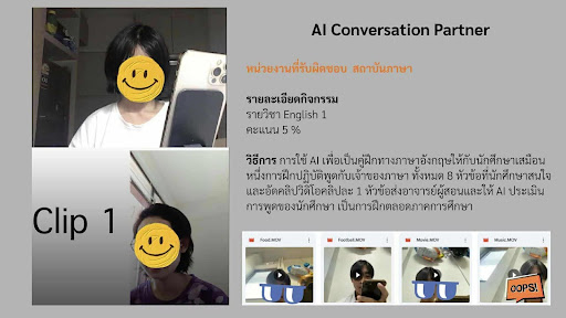 อาจารย์ผู้สอนได้บูรณาการการใช้ปัญญาประดิษฐ์เข้ากับการเรียนการสอนอย่างสร้างสรรค์ ผ่านกิจกรรม “Conversation Partner” ในรายวิชาภาษาอังกฤษ 1 และ “Improving Writing by AI” ในรายวิชาภาษาอังกฤษ 2 นักศึกษาสามารถเลือกหัวข้อสนทนาที่สนใจ ไม่ว่าจะเป็นการแนะนำตนเอง การสัมภาษณ์งาน หรือการนำเสนอโครงการ เพื่อฝึกทักษะการพูดนอกเวลาเรียน หรือให้ AI ช่วยให้คำแนะนำเกี่ยวกับงานเขียนภาษาอังกฤษ การเรียนรู้จึงไม่หยุดนิ่งเพียงในห้องเรียน แต่ขยายไปสู่ทุกมิติของชีวิตประจำวัน