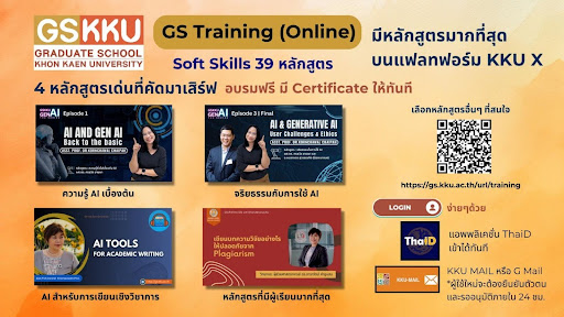 บัณฑิตวิทยาลัย มหาวิทยาลัยขอนแก่น ขอเชิญผู้สนใจร่วมพัฒนาทักษะที่จำเป็นสำหรับโลกยุคใหม่ กับโครงการ GS Training (Online) ที่รวบรวมหลักสูตร Soft Skills คุณภาพ 39 หลักสูตร ให้ทุกท่านได้เรียนรู้และพัฒนาตนเองได้ทุกที่ทุกเวลา บนแพลตฟอร์มการเรียนรู้ KKU X พิเศษ! อบรมฟรี ไม่มีค่าใช้จ่าย พร้อมรับ E-Certificate ทันที เมื่อผ่านเกณฑ์ที่กำหนด