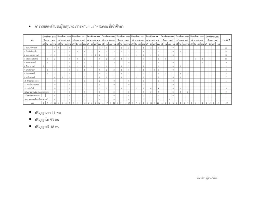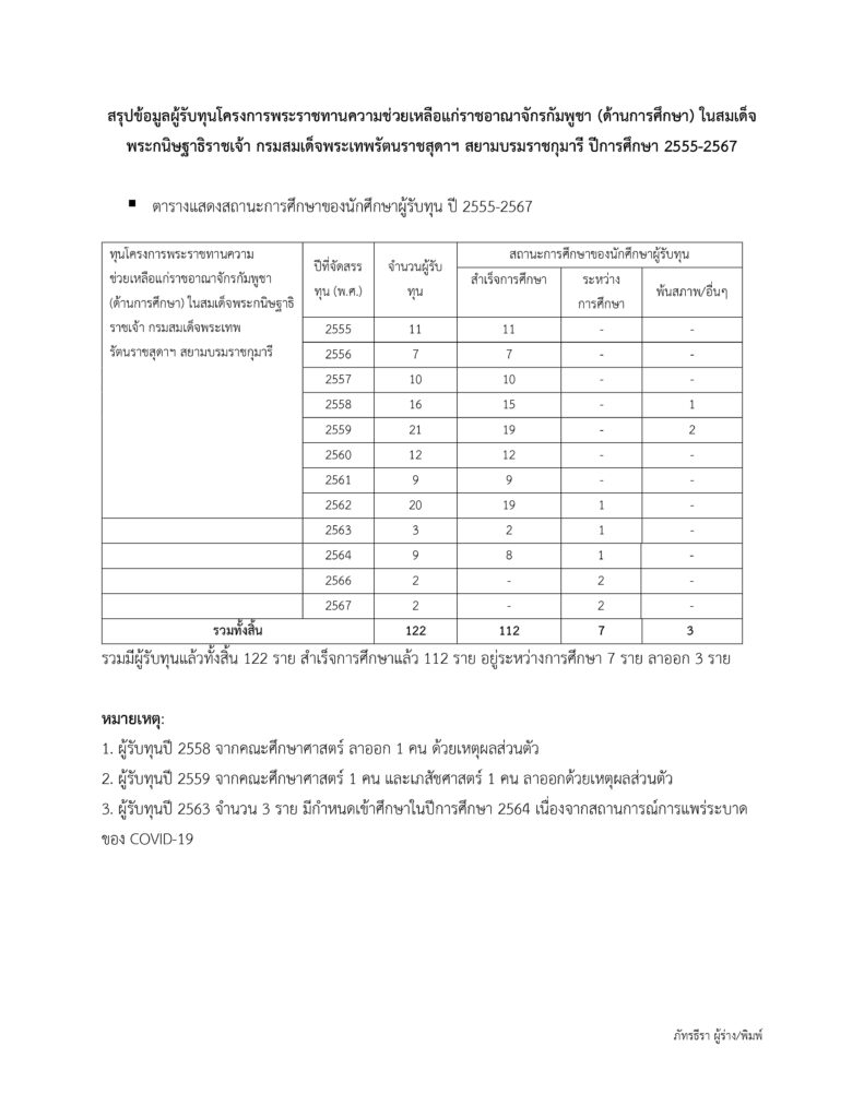 สรุปข้อมูลผู้รับทุนโครงการพระราชทานความช่วยเหลือแก่ราชอาณาจักรกัมพูชา (ด้านการศึกษา) ในสมเด็จพระกนิษฐาธิราชเจ้า กรมสมเด็จพระเทพรัตนราชสุดาฯ สยามบรมราชกุมารี ปีการศึกษา 2555-2567