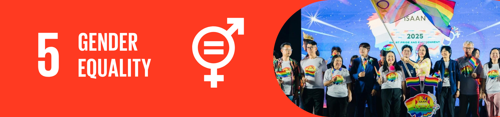 มหาวิทยาลัยขอนแก่นส่งเสริมสนับสนุนการขับเคลื่อนสังคมสู่ความเท่าเทียมทางเพศ (SDG 5) โดยมีเป้าหมายสำคัญในการสร้างสังคมที่เสมอภาคและเท่าเทียมสำหรับทุกคน ผ่านการ “กำหนดนโยบายไม่เลือกปฏิบัติ” การส่งเสริมความเท่าเทียมทางเพศ การต่อด้านการปฏิบัติที่ไม่เหมาะสมกับเพศหญิง บุคคลข้ามเพศ และผู้พิการ นอกจากนี้ มหาวิทยาลัยมีการจัดสภาพแวดล้อมต่างๆเพื่อส่งความเท่าเทียมด้านเพศ เช่น