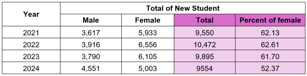 Khon Kaen University has consistently promoted women’s participation, starting from the admission of students at all levels, including bachelor’s, master’s, and doctoral degrees. Announcements for admissions are made every academic year, and the application process is publicized nationwide through the university’s website and the websites of the respective departments. Most applicants come from schools in the northeastern region, with some from other parts of the country. Khon Kaen University offers opportunities for female students to enroll in all faculties and programs. Each year, the number of new female students increases, with women making up more than 50% of the total student population, according to the table of new female student admissions (2021-2024).