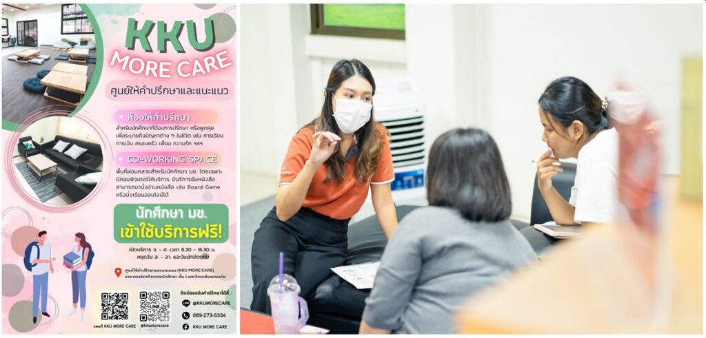 มหาวิทยาลัยมีการดูแลให้คำปรึกษาในด้านต่างๆ  ได้แก่  การให้คำปรึกษาด้านสุขภาพจิต  การให้คำปรึกษาด้านการใช้ชีวิต  การให้คำปรึกษาด้านการเงิน ทุนการศึกษาและการกู้ยืมฉุกเฉิน ดังนั้น จึงได้มี การจัดตั้งศูนย์ให้คำปรึกษาและ แนะแนวสำหรับนักศึกษามหาวิทยาลัยขอนแก่น “KKU More Care” ว่า การดูแลสุขภาพจิต ของนักศึกษา ถือเป็นเรื่องที่มหาวิทยาลัยขอนแก่นให้ความสำคัญในลำดับต้นๆ เนื่องจากหลายปัจจัย ที่ส่งผลกระทบต่อความเป็นอยู่และการพัฒนาของนักศึกษาในสังคมที่มีการเปลี่ยนแปลงอย่างรวดเร็ว โดยเฉพาะอย่างยิ่งในด้านการศึกษาและการทำงานที่มีความคาดหวังสูงจากทั้งสังคมและครอบครัว ทำให้นักศึกษาเกิดความเครียดและความวิตกกังวลเพิ่มมากขึ้น ดังนั้นการแก้ไขตั้งแต่จุดเริ่มต้นจึงมีความสําคัญอย่างมาก  หาวิทยาลัยขอนแก่น จึงจัดตั้งศูนย์ให้คําปรึกษาและแนะแนว หรือ KKU More Care ตั้งอยู่ที่กองพัฒนาศึกษาและศิษย์เก่าสัมพันธ์ มีนักจิตวิทยาที่มีความเชี่ยวชาญในการดูแลปัญหาของนักศึกษา ไม่ว่าจะเป็นเรื่องของสุขภาพจิตและปัญหาอื่นๆ ก็สามารถเข้ามาขอคำปรึกษาได้ ทั้งในและนอกเวลาราชการ ส่วนช่องทางของโซเชียล ทางศูนย์จะมีระบบในการจะให้นักศึกษานัดหมายผ่านระบบได้