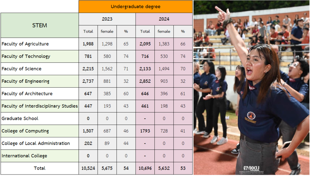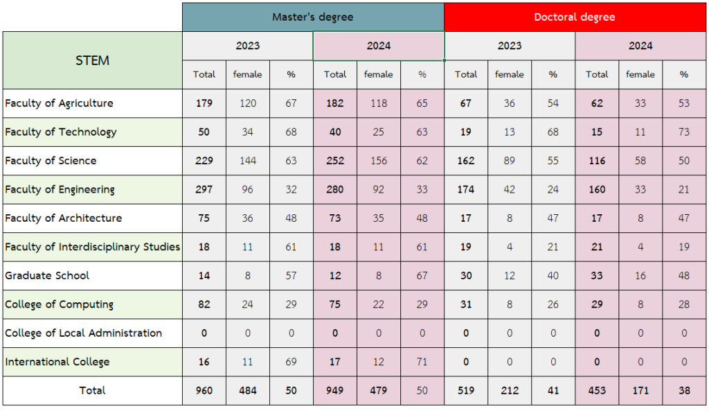 Khon Kaen University opens admissions for new students every academic year and accepts female students at all levels, including undergraduate, master’s, and doctoral programs. This includes fields that are traditionally less popular among female students, as some fields have historically favored male students due to physical demands of certain professions. However, in the current context, there is gender equality, and there is no gender discrimination in admissions. Therefore, Khon Kaen University has a policy of admitting female students in all fields of study offered by the university, especially in health sciences (STEM). Currently, there is a significant and increasing number of female students enrolling in science and technology fields at all levels of education, as shown in the table of female student enrollment in these fields.