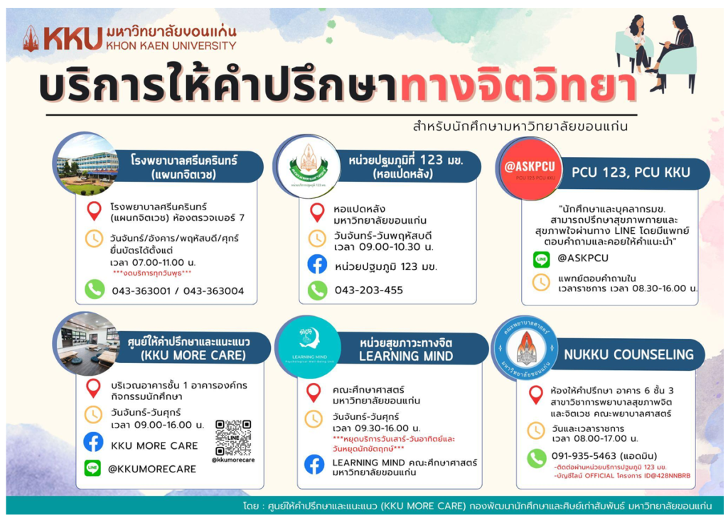 1. โรงพยาบาลศรีนครินทร์ แผนกจิตเวช มหาวิทยาลัยขอนแก่น โดยนักศึกษาสามารถเข้าถึงและดูแลให้คำปรึกษาฟรี